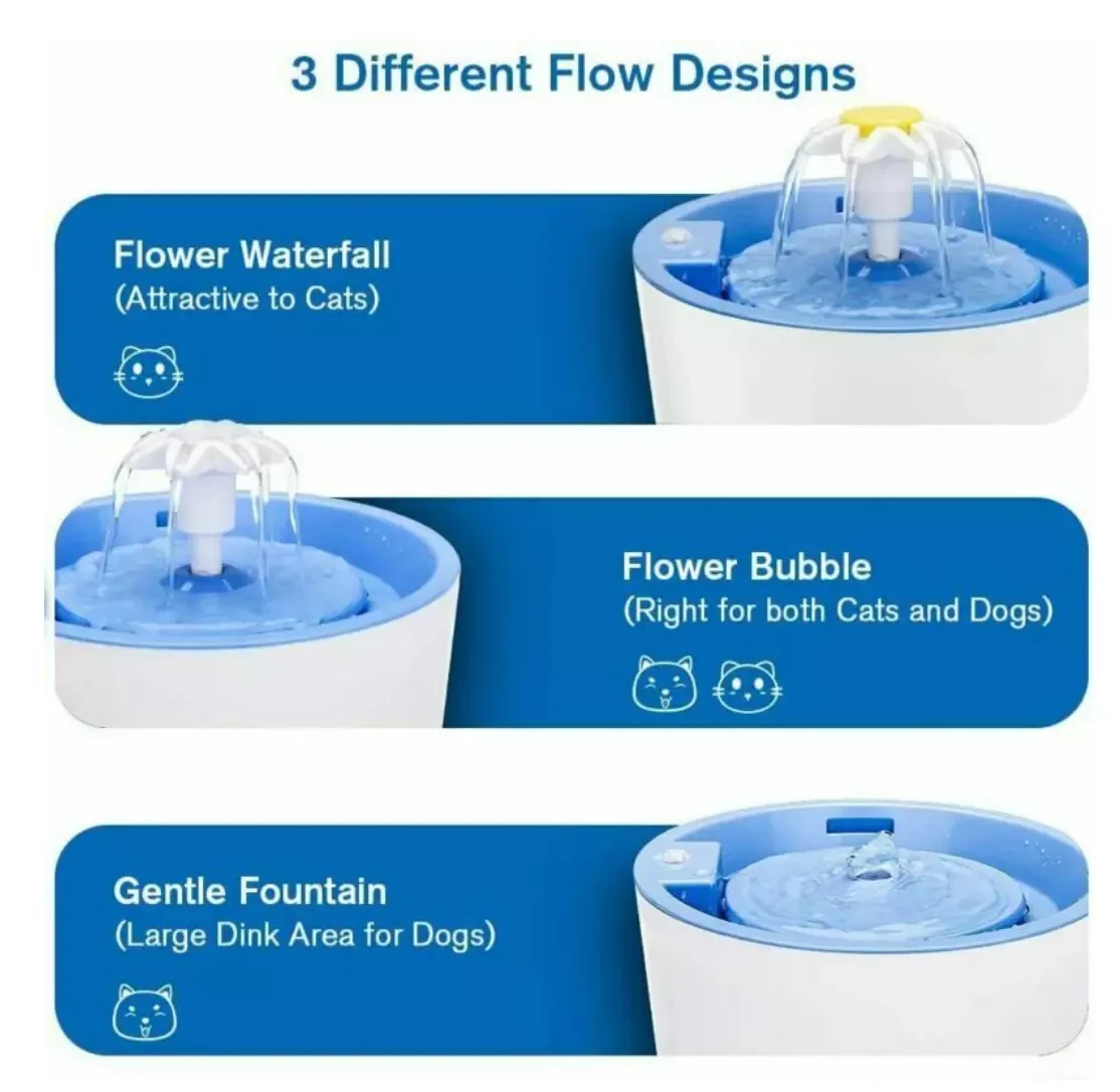 - Three Flow Designs: Choose between a flower waterfall (for cats), flower bubble (for both cats & dogs), or a gentle fountain (for dogs with a large drinking area).
