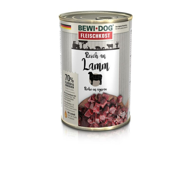 Bewi Dog Rich in Lamb is a high-quality wet food designed to provide balanced nutrition for dogs of all breeds. Made with juicy, firm-textured lamb meat, this gently cooked recipe helps retain essential nutrients while delivering a flavourful and satisfying meal.