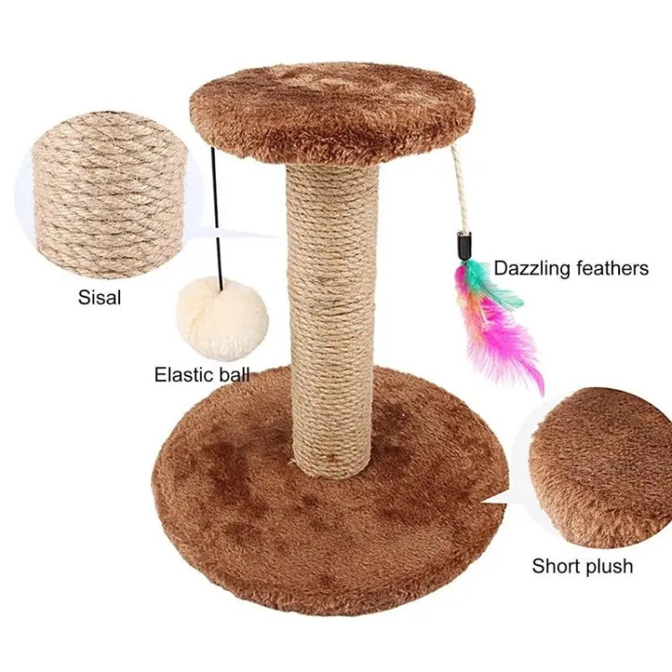 Give your cat a satisfying place to scratch, play, and lounge with this compact scratching post. Featuring a sisal-wrapped post, soft plush surfaces, hanging toys, and vibrant feathers, this all-in-one piece helps protect your furniture while keeping your cat entertained.