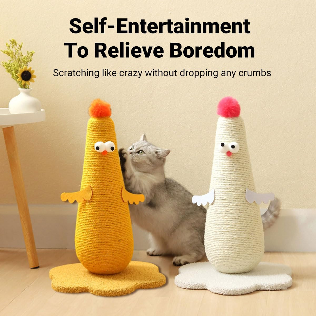 Bring fun and function together with this adorable chicken-shaped cat scratching post. Wrapped in durable natural sisal rope, it satisfies your cat’s natural scratching instincts while protecting your furniture. Its playful chicken design with fluffy crest and wings adds a touch of humor and charm to your home, making it both a cat accessory and a cute décor piece.