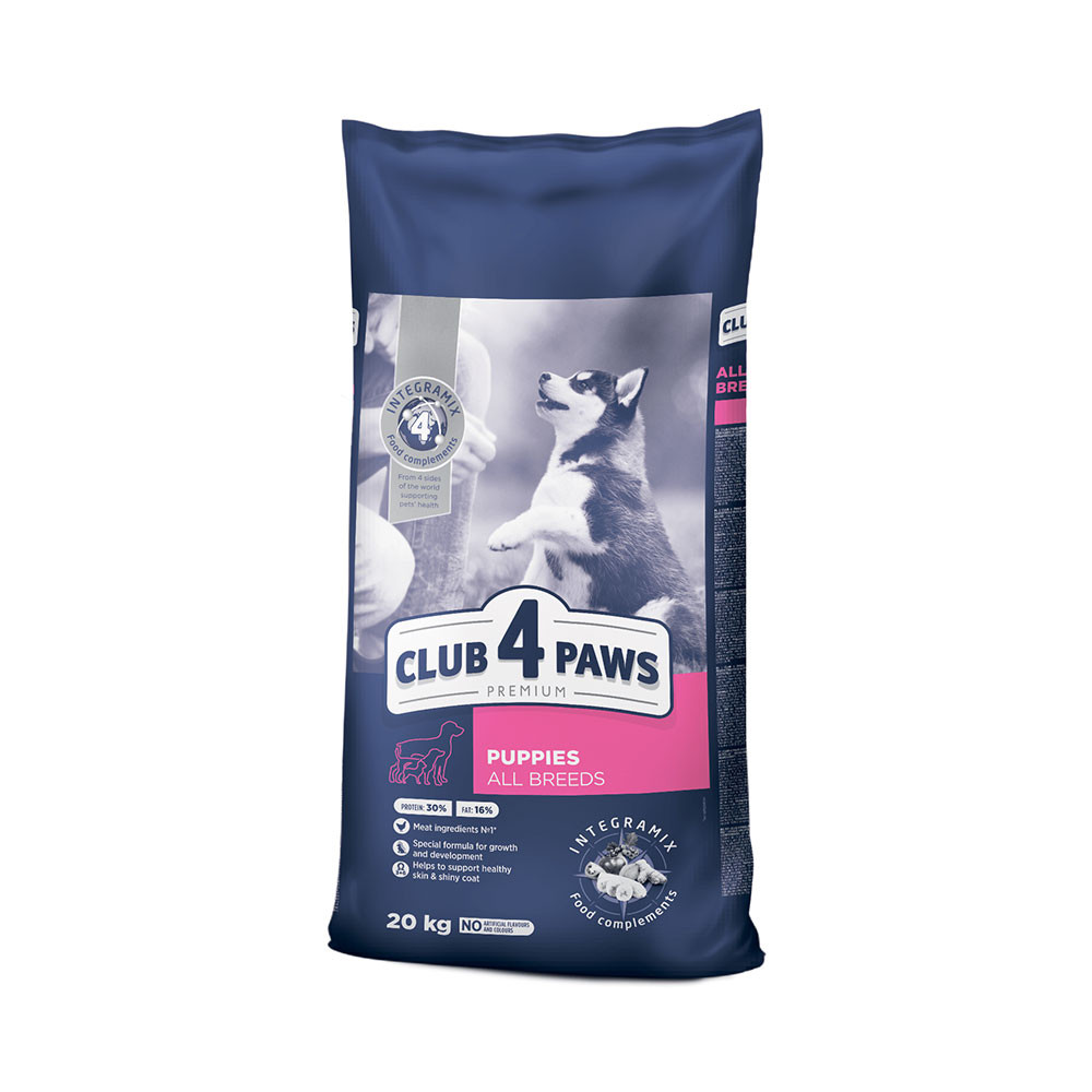 CLUB 4 PAWS Premium for Puppies "Rich in Chicken" is formulated to support healthy growth during the first 12 months of life. This dry premium nutrition features meat as the first ingredient, including 30% chicken, and is enriched with Omega 3 + Omega 6 fatty acids for a shiny coat and healthy skin. The special INTEGRAMIX formula boosts immunity and supports overall health, making it an excellent choice for growing puppies of all breeds.