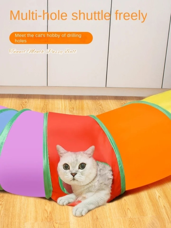 Keep your cat active, curious, and entertained with this vibrant foldable cat tunnel. Designed with multiple entry and exit points, this tunnel satisfies cats' natural instinct to explore and hide. The bright rainbow colors add a playful aesthetic to any space, while the durable polyester fabric ensures long-lasting use.