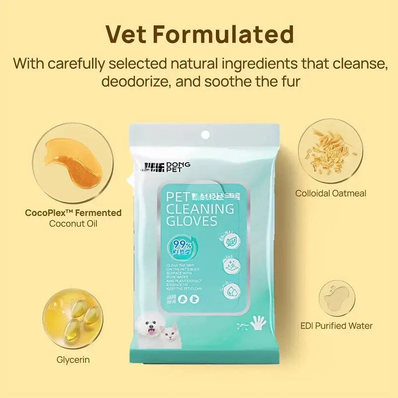 These DongPet Cleaning Gloves are formulated by veterinarians to make pet cleaning effortless. Enriched with CocoPlex™ Fermented Coconut Oil, Colloidal Oatmeal, Glycerin, and EDI Purified Water, they cleanse, deodorize, and moisturize your pet’s coat — no water or rinsing required.