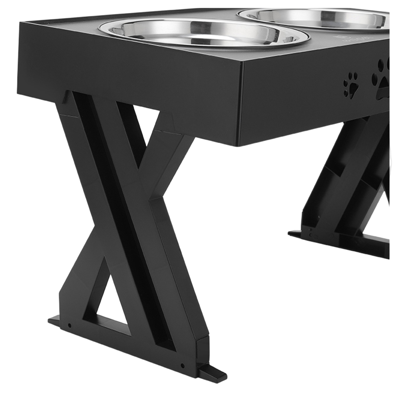 The modern black plastic stand features foldable X-shaped legs for easy setup and storage, while the cute paw-print cutouts add a stylish touch to your home. The dual bowls are perfect for serving food and water simultaneously and are easy to clean, dishwasher-safe, and rust-resistant.