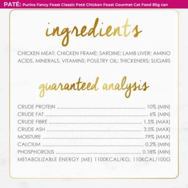 Fancy Feast Adult Classic Paté Chicken Feast Gourmet Wet Cat Food is a smooth and delicious paté crafted with real, high-quality chicken to satisfy your cat's taste buds. This gourmet wet food provides 100% complete and balanced nutrition for your cat's daily needs.
