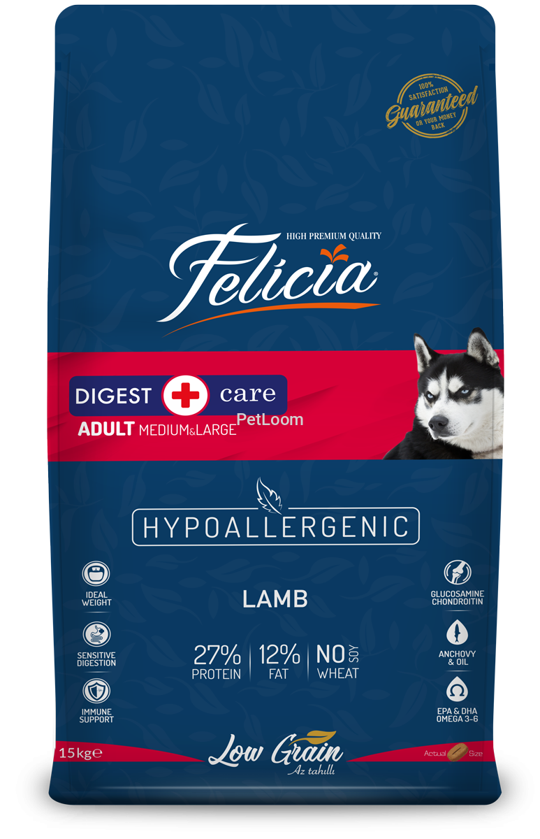 Felicia® Digest Care Adult with Lamb is a super-premium, hypoallergenic dry food designed to meet the unique needs of medium and large breed adult dogs—especially those with sensitive digestion. Carefully formulated with real lamb meat and anchovy, this recipe offers optimal nutrition, superior digestibility, and enhanced palatability to help your dog live a healthy, active life.