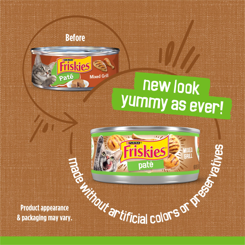 - This Friskies cat food recipe is packaged in recyclable cat food cans and proudly manufactured in Purina-owned facilities