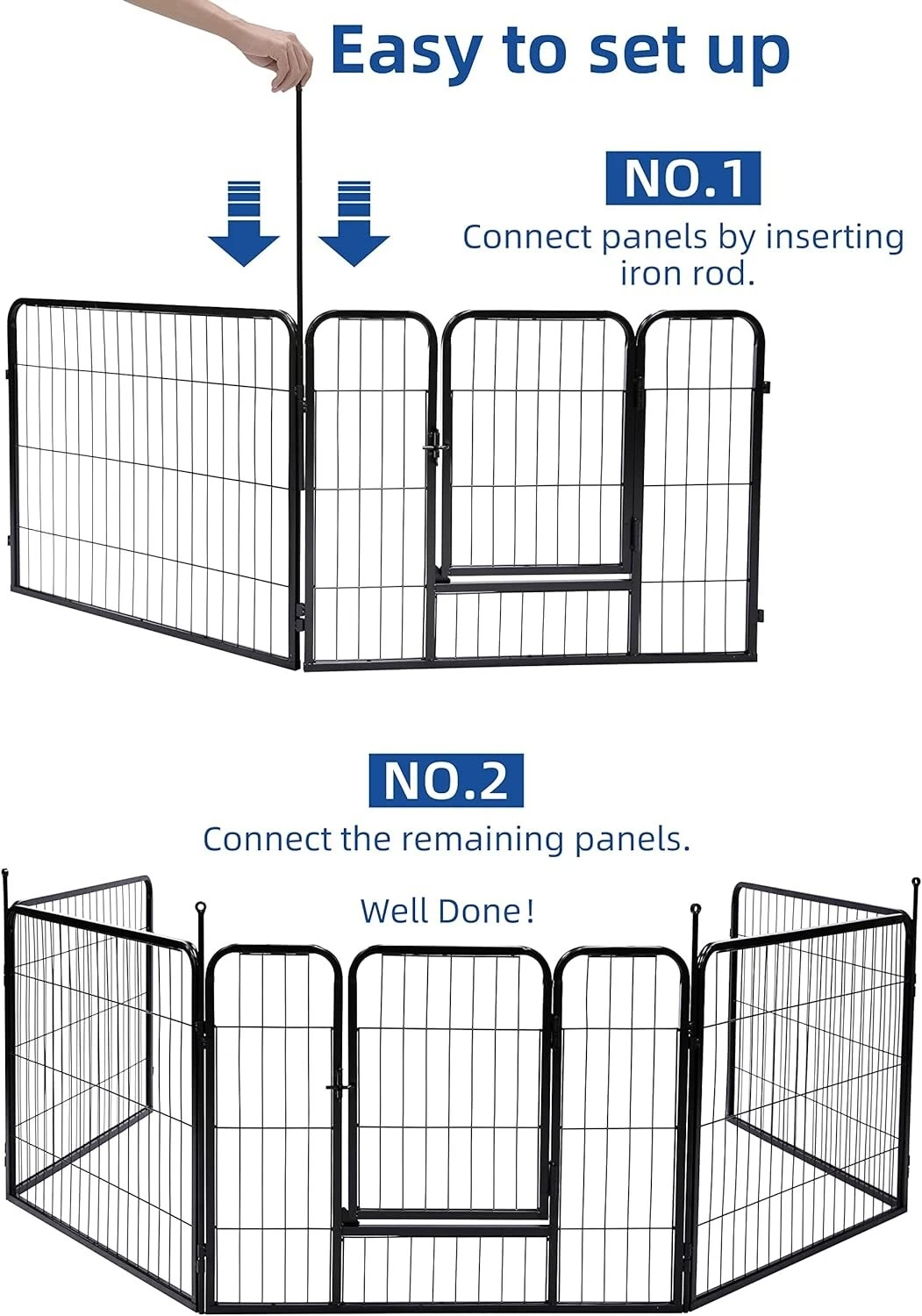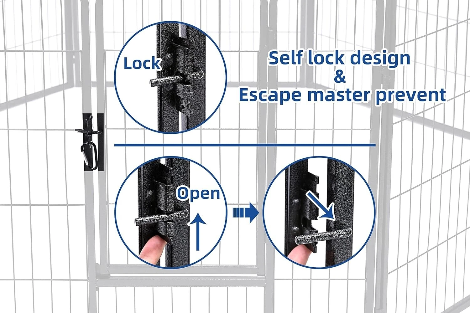 The secure door features a self-locking latch to help prevent escapes, while the tall metal panels ensure excellent ventilation and visibility. Whether used for training, playtime, or temporary containment, this playpen offers durability, convenience, and peace of mind.
