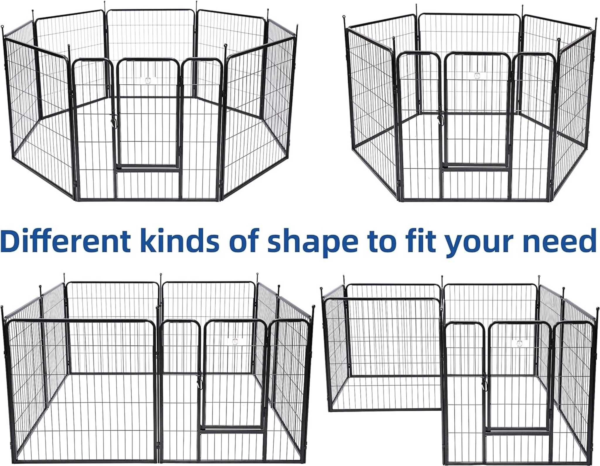 This heavy-duty foldable pet playpen provides a safe, spacious, and flexible enclosure for dogs and other pets, suitable for both indoor and outdoor use. Designed with 8 sturdy metal panels, the playpen can be assembled into multiple shapes to fit your space and your pet’s needs.