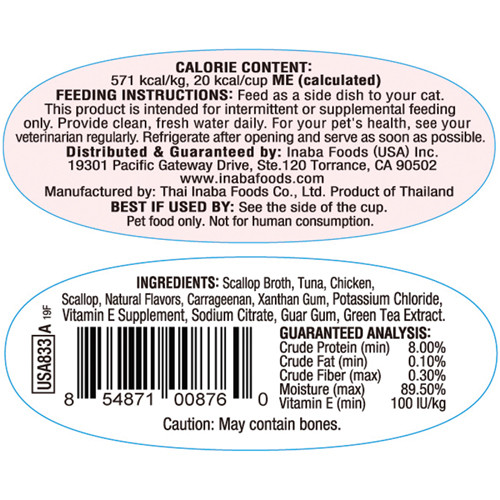 Scallop Broth, Tuna, Chicken, Scallop, Natural Flavors, Carrageenan, Xanthan Gum, Potassium Chloride, Vitamin E Supplement, Sodium Citrate, Guar Gum, Green Tea Extract
