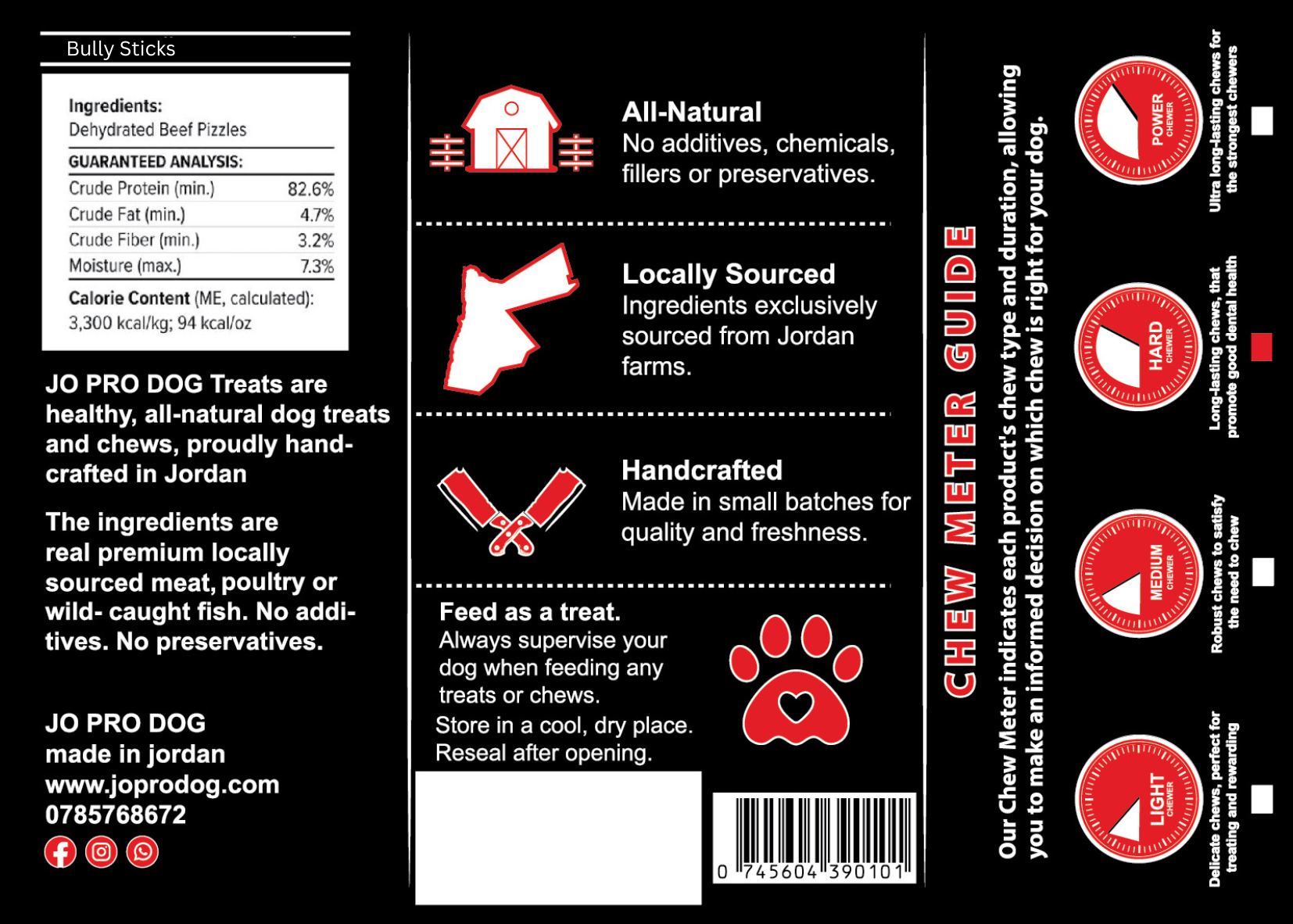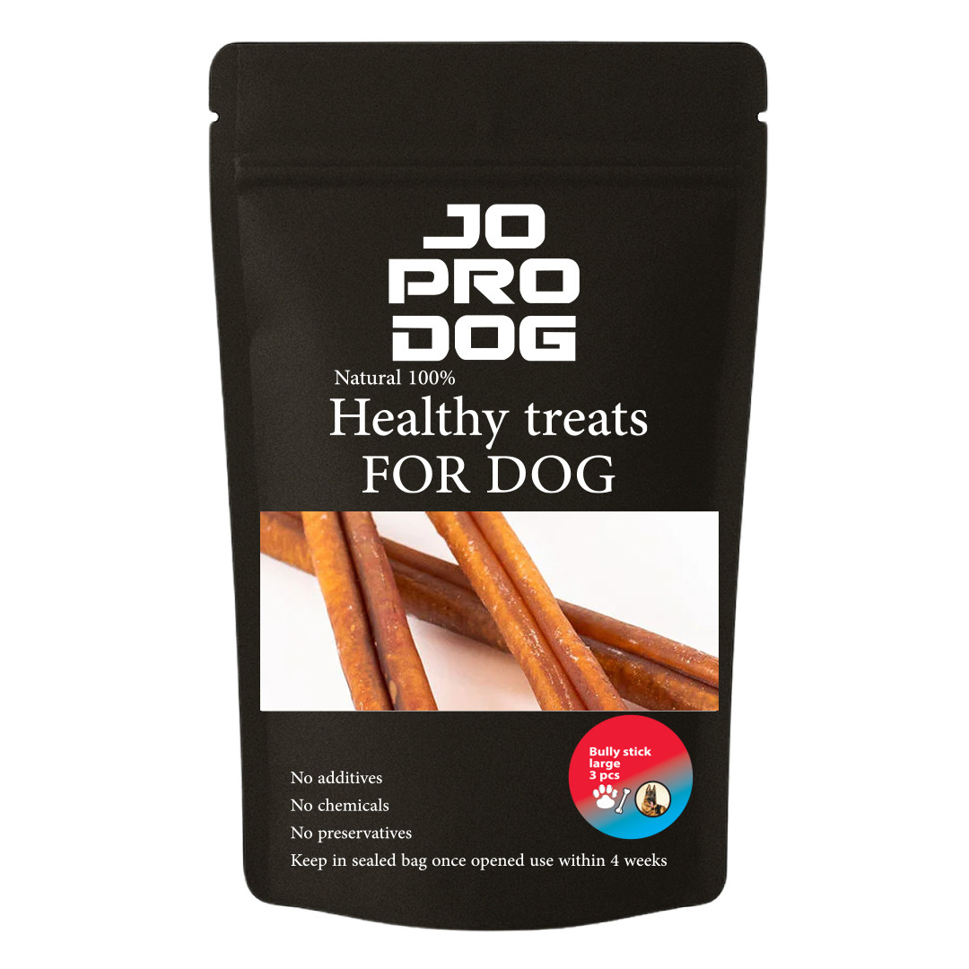 Jo Pro Dog Bully Sticks are wholesome, air-dried, single-ingredient chews crafted from premium, fresh beef. Each stick is gently dried and chemical-free, locking in rich natural flavor while preserving nutrients. These satisfying chews promote dental health, aid digestion, and fulfill your dog’s instinctive need to chew — all while keeping them happily occupied.