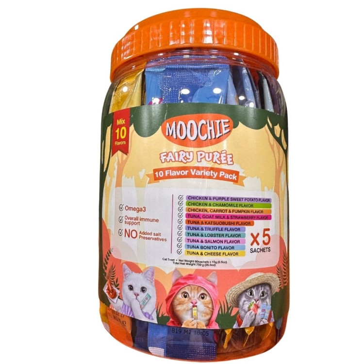 Spoil your cat with Moochie Fairy Purée 10 Flavor Pack — a creamy fusion of taste and nutrition made to strengthen bonds and keep your feline healthy and happy.