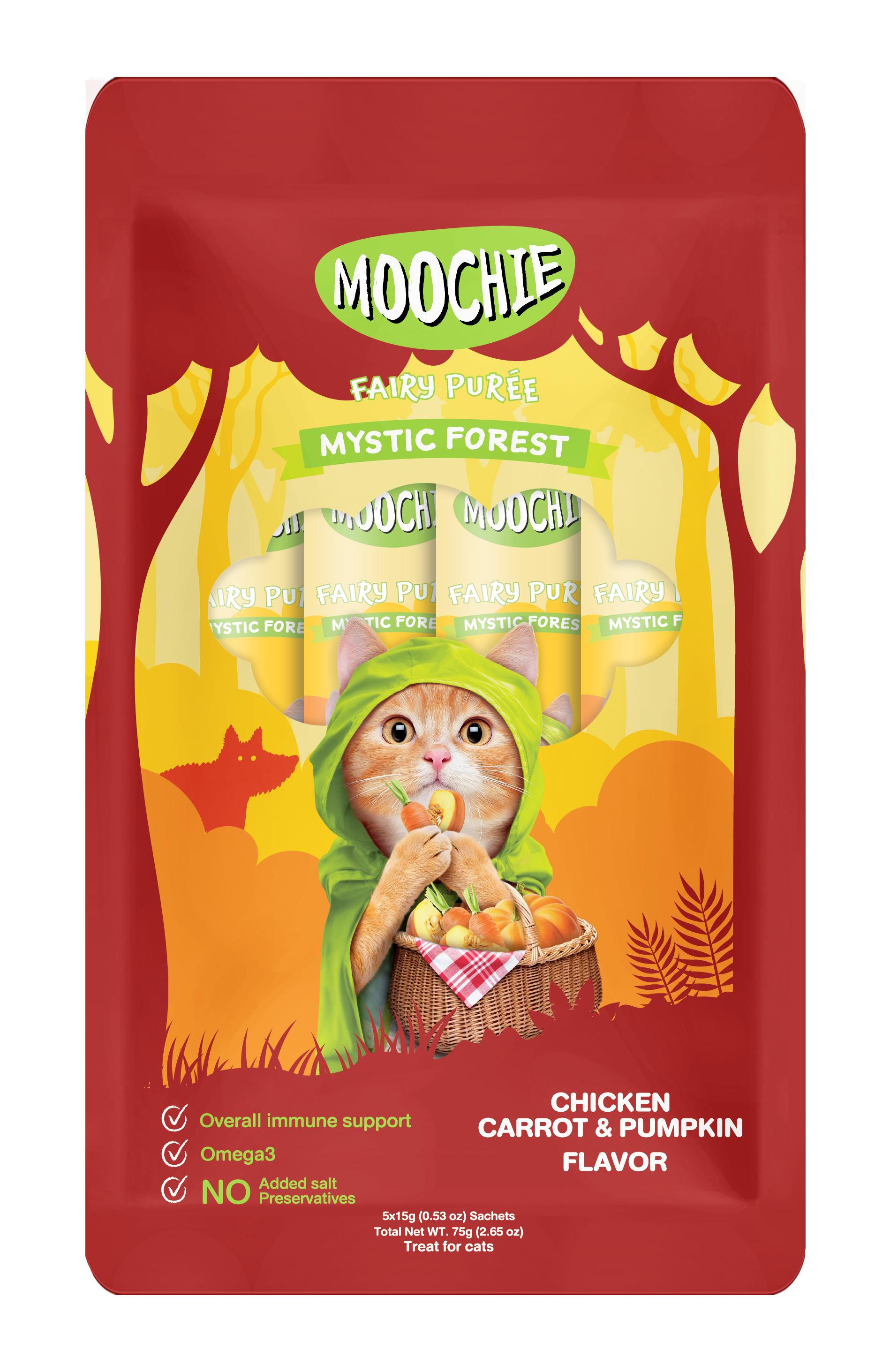 Infused with nature’s gentle ingredients, Moochie Fairy Purée Mystic Forest Chicken Carrot & Pumpkin Flavour offers your feline companion a delicious and nutritious boost—every day.