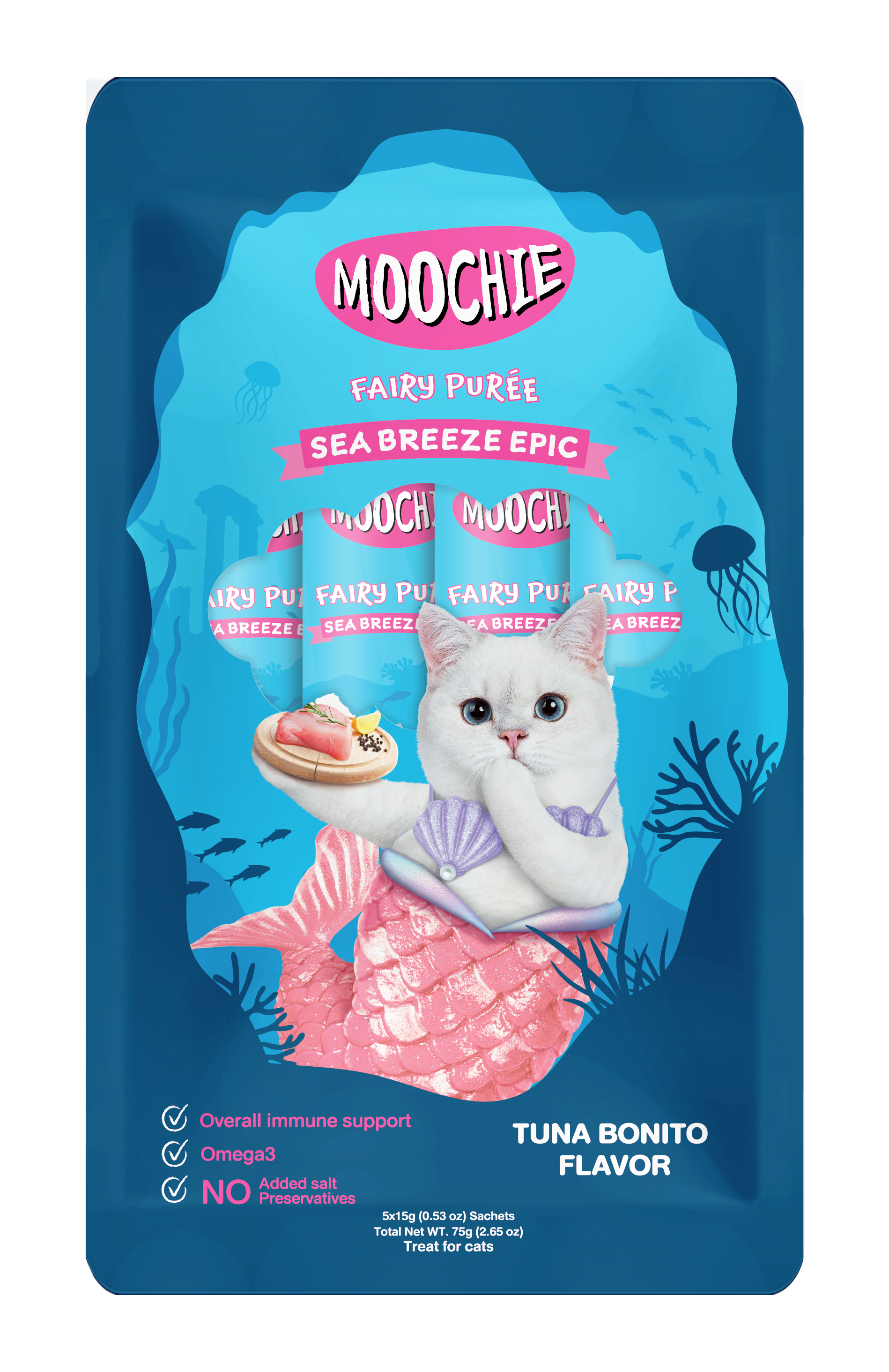 Treat your furry companion to a burst of ocean-inspired flavor with Moochie Fairy Purée Sea Breeze Epic – where taste meets essential nutrition in every silky-soft lick.