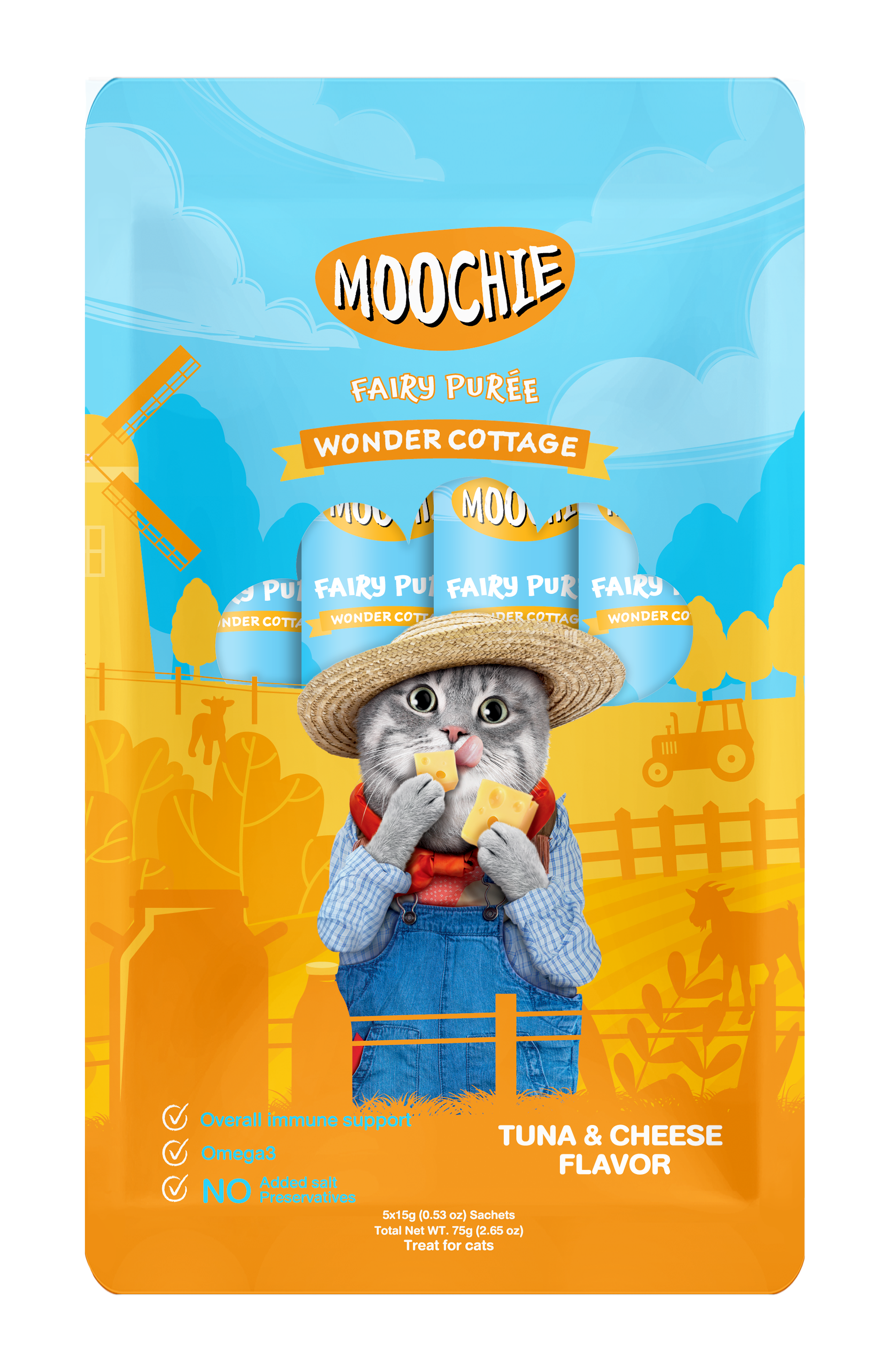 Crafted for cats who love creamy indulgence, Moochie Fairy Purée Wonder Cottage in Tuna & Cheese flavour delivers a deliciously smooth treat with real tuna and a cheesy twist. Enriched with taurine for heart and vision support, and omega-3 from salmon oil for a shiny coat, this purée is as nutritious as it is irresistible.