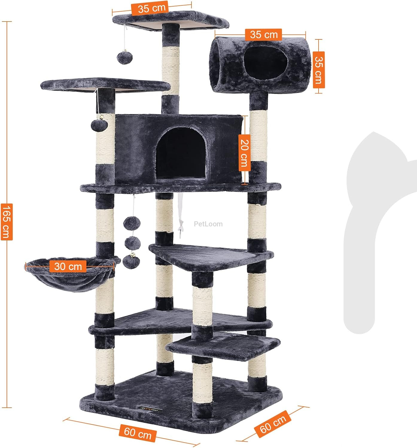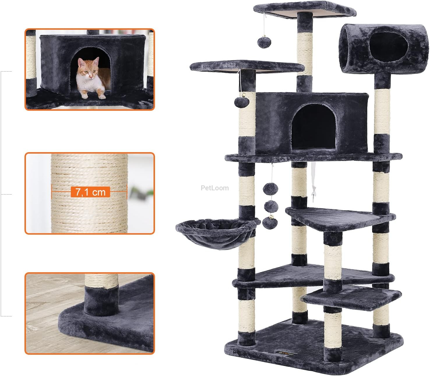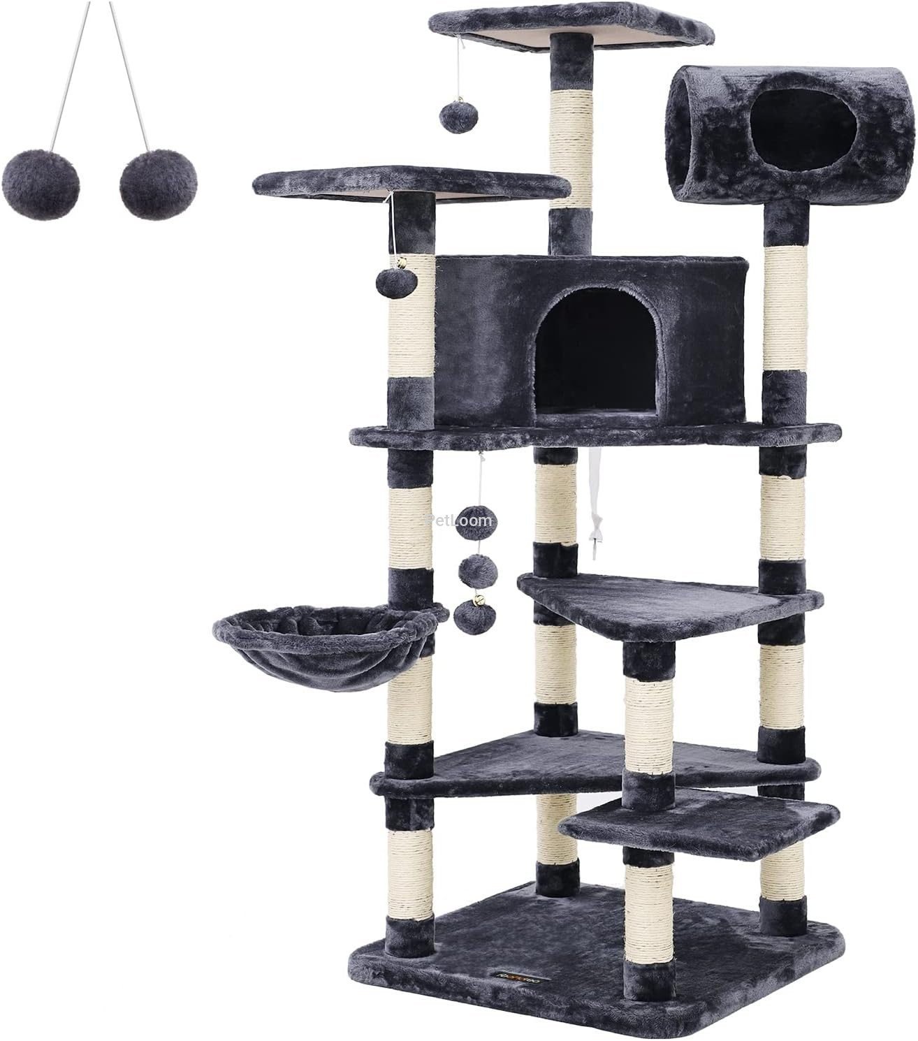 This 165 cm cat tree tower combines comfort, fun, and functionality in one structure. With a tunnel, hammock, condos, toys, and scratching posts, it’s the ultimate activity and relaxation hub for cats of all ages.
