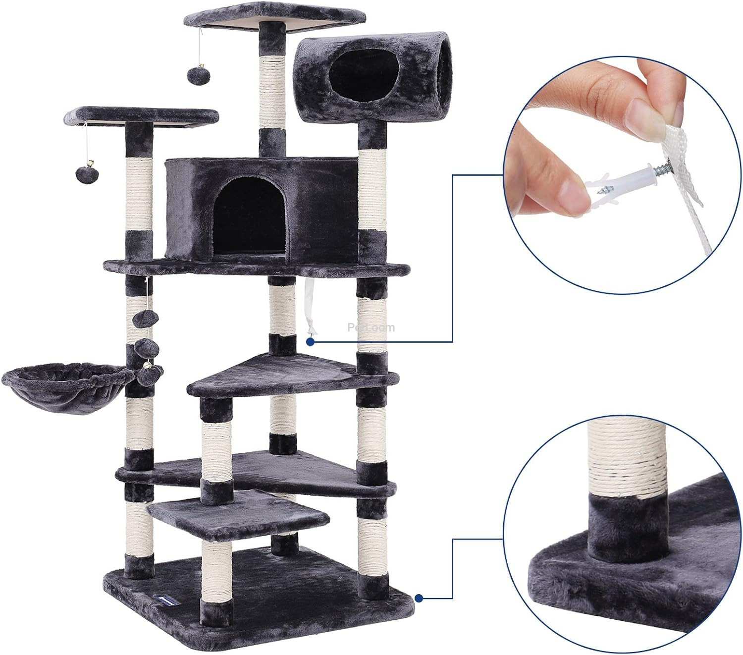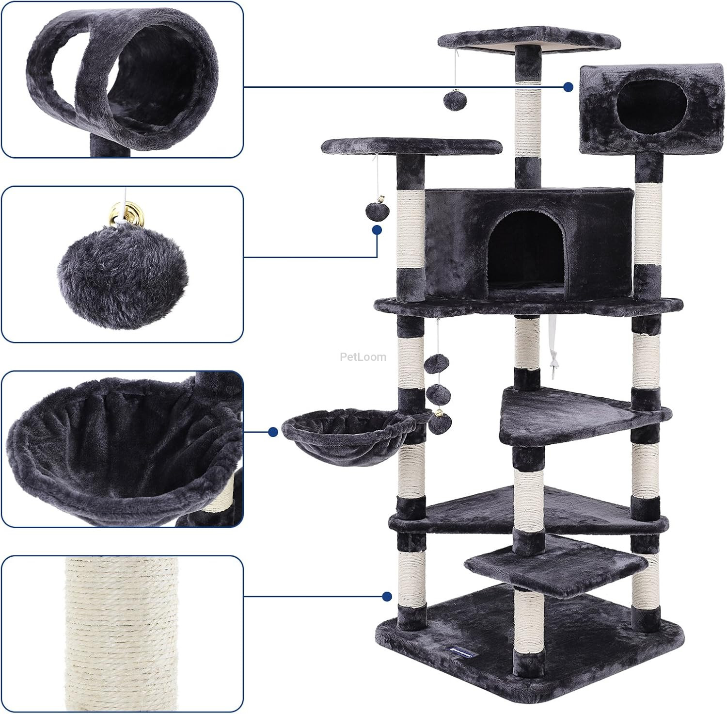 This stylish and multifunctional cat tree tower gives cats a complete playground for climbing, scratching, resting, and playing. With multiple platforms, a cozy tunnel, a hammock, and hanging toys, it keeps cats active, comfortable, and entertained.