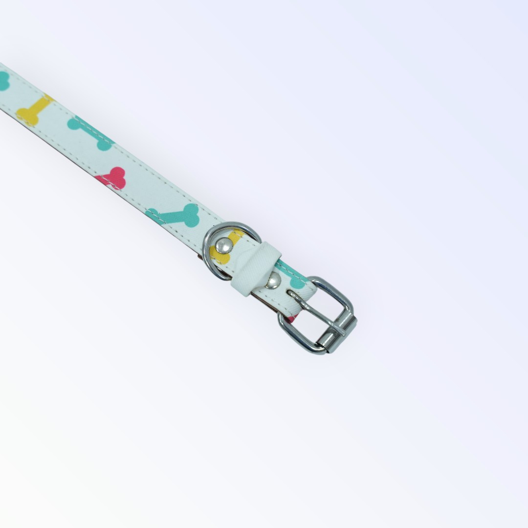 A playful and durable genuine leather dog collar featuring a vibrant pattern of bones and hearts—perfect for pets with personality.