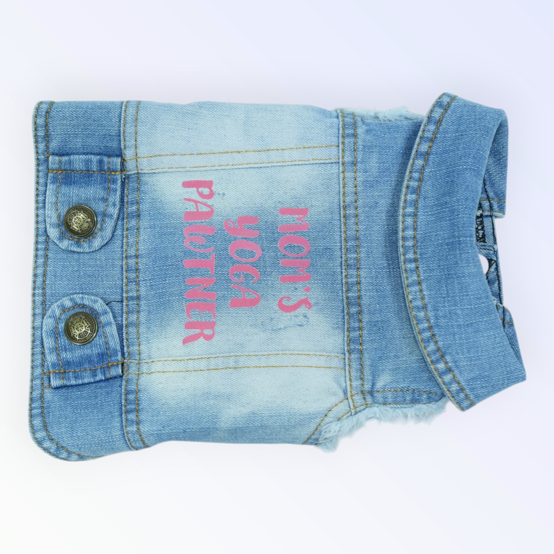 This adorable denim jacket features the fun and playful print “Mom’s Yoga Partner” in pink, making it a perfect fit for stylish pups with active moms. Made from high-quality, vintage-washed blue denim, this jacket brings comfort and flair to your pet’s wardrobe. The soft inner lining ensures all-day coziness, while the sleeveless design and snap buttons allow for easy wear and a secure fit. It’s ideal for summer strolls, cute photo shoots, or just lounging in comfort and charm.