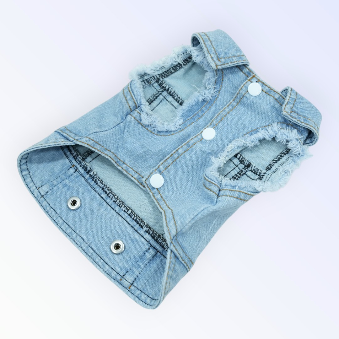 Crafted from high-quality denim, this piece provides durability for everyday wear while maintaining a soft inner lining to ensure your furry friend stays cozy. Frayed armholes and authentic-style metal button snaps complete the vintage vibe, making it ideal for photo shoots, walks, or lounging in style.
