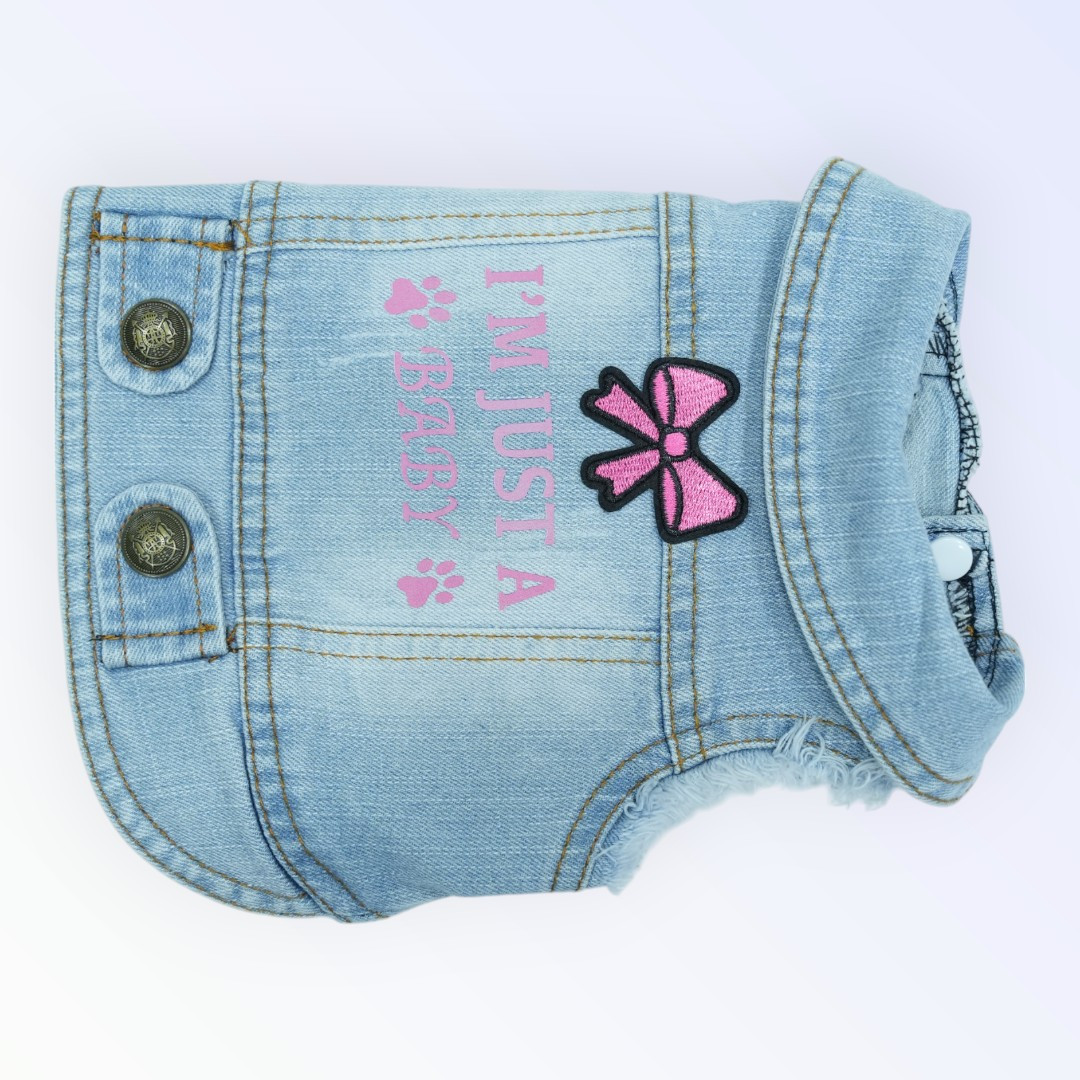 Add a touch of adorable charm to your pet’s wardrobe with this light-washed denim jacket featuring the sweet slogan “I’m Just a Baby” alongside a stitched pink bow. Designed for small dogs, this jacket blends playful personality with practical comfort—perfect for pups who love attention and cuddles.