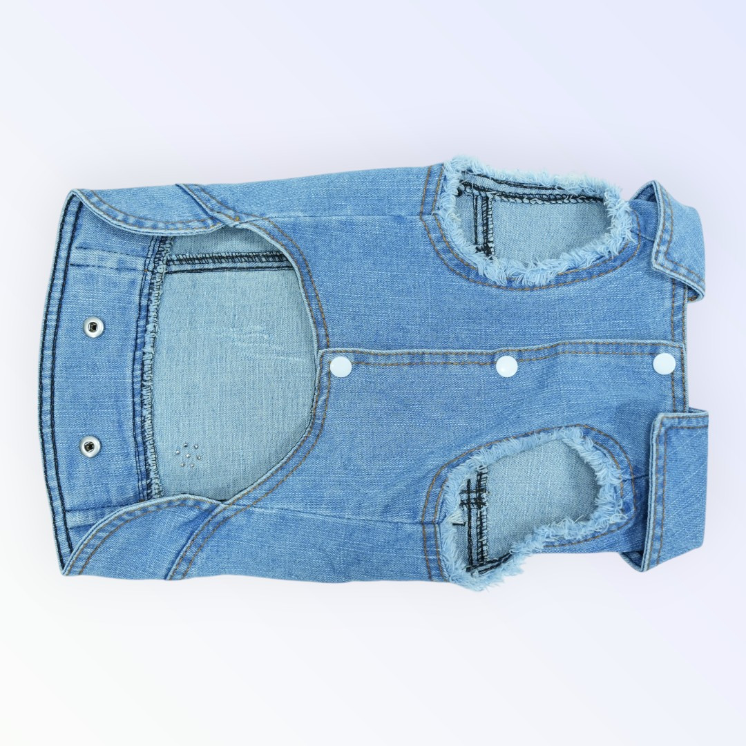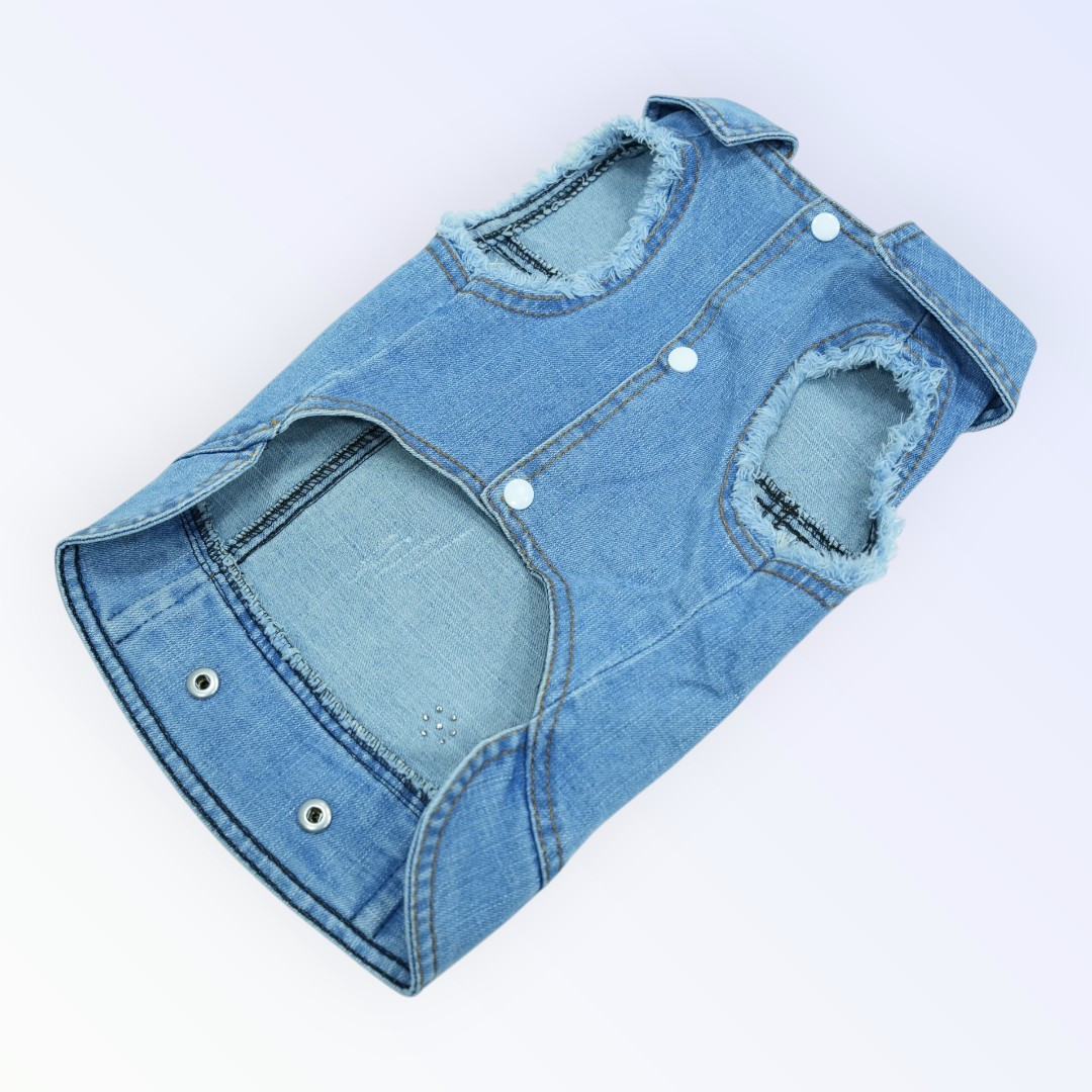 Add a sweet and sassy flair to your pet's wardrobe with this denim jacket featuring the playful quote “Looks like a cinnamon roll… could kill you” and stitched-on pearl embellishments. These are real decorative pearls, carefully sewn into the fabric to add texture and elegance. Made from soft, washed denim with distressed edges, this jacket balances fashion and comfort perfectly. Its lightweight design makes it ideal for everyday wear in warmer seasons, while the button snaps ensure easy on and off. A charming statement piece that’s both adorable and practical for your stylish pup.