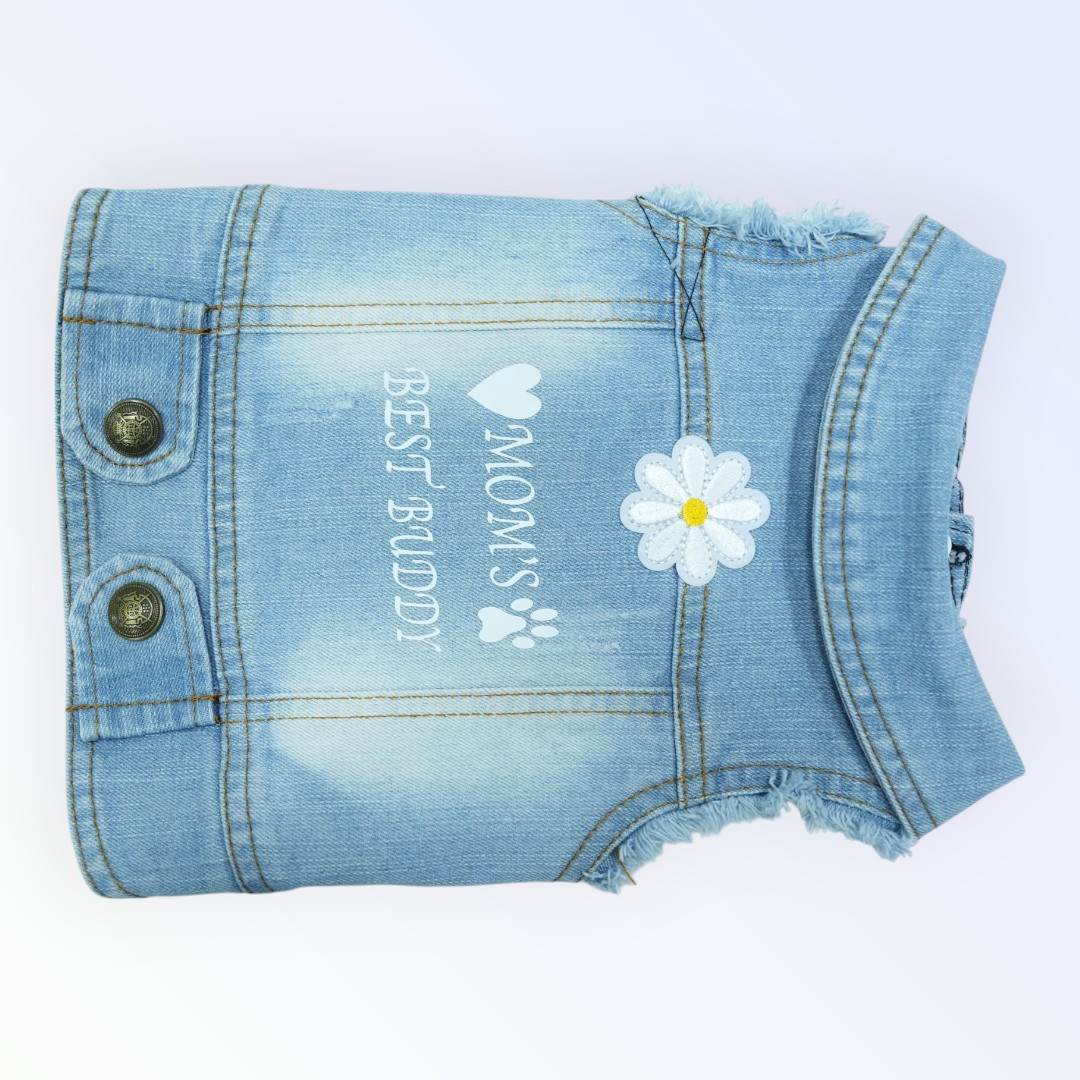 Celebrate the special bond between you and your furry friend with this heartwarming denim jacket featuring the phrase “Mom’s Best Buddy.” The design includes a cheerful white daisy patch that’s securely stitched, adding a cute and textured detail. Made from vintage-washed denim with distressed trim and a soft inner lining, this jacket offers both charm and comfort. Lightweight and breathable, it’s ideal for casual walks, playdates, or just showing off your pet’s adorable personality.