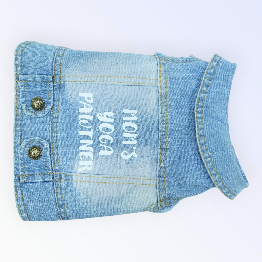 Pet Clothes Dog Jeans Jacket – “Mom’s Yoga Pawtner” Print (M)