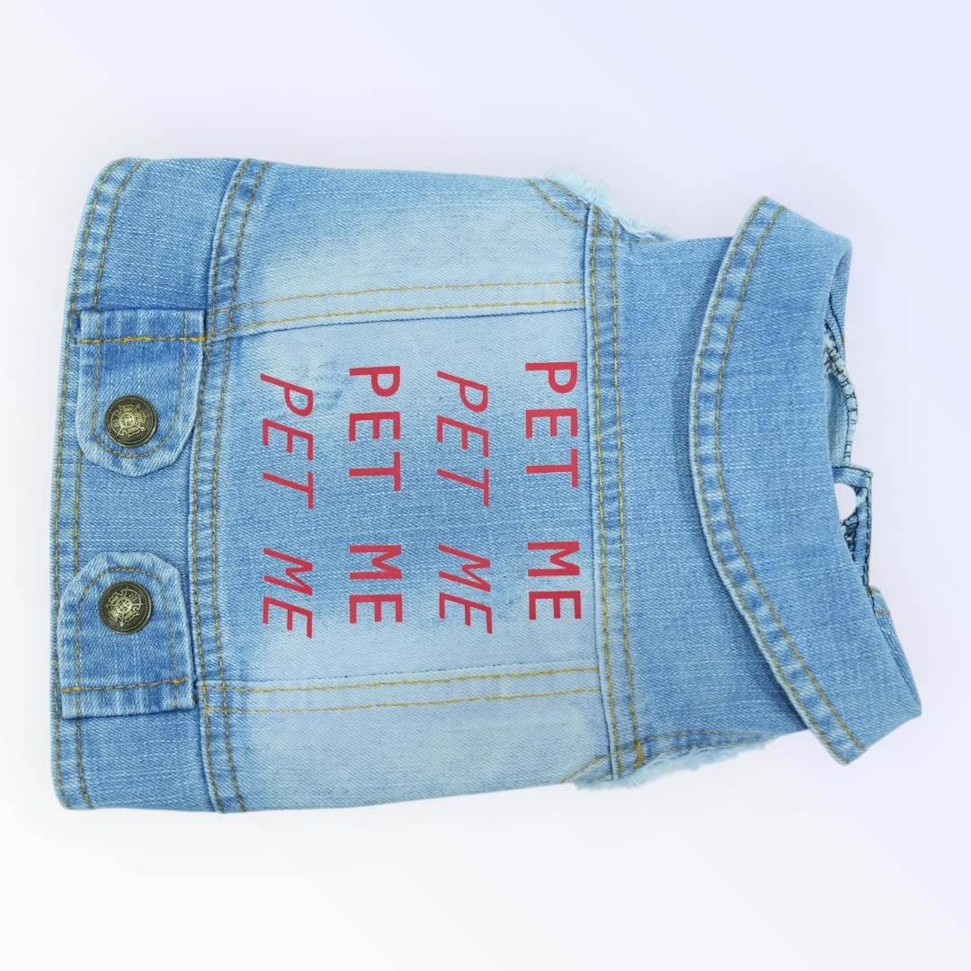 Pet Clothes Dog Jeans Jacket – “Pet Me” Repeated Print (M)