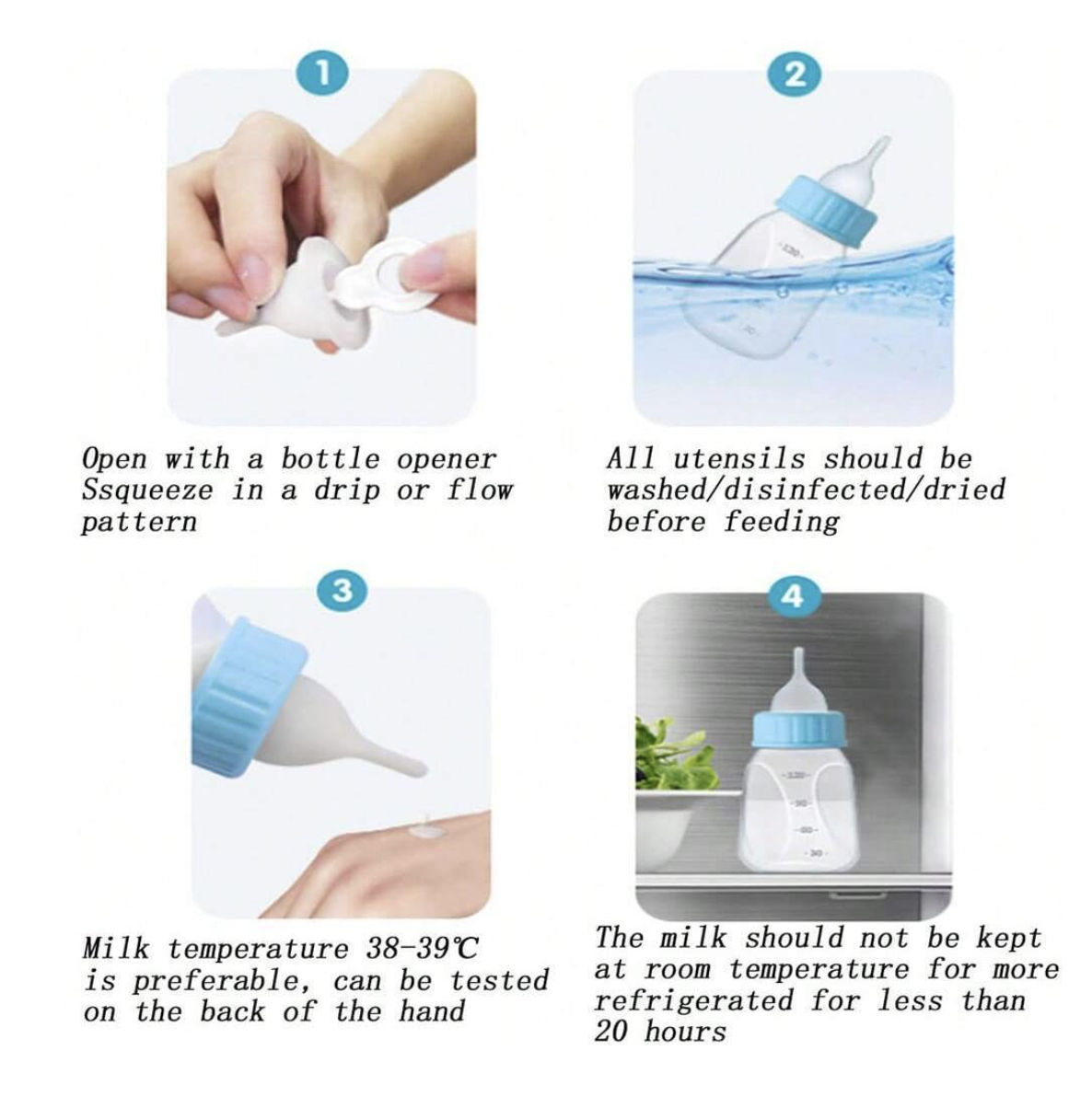 Safe Temperature Feeding: Milk should be warmed to 38–39°C and tested on the back of your hand before feeding.