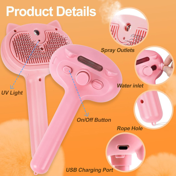 Upgrade grooming time with the Pet Spray Hair Brushing Comb, a multifunctional 4-in-1 grooming solution designed to comb, clean, massage, and deshed your pet’s coat while keeping it healthy and shiny. This smart grooming tool combines steam mist and UV light technology for an enhanced grooming experience.