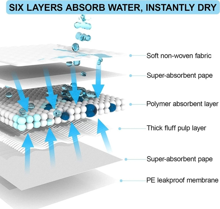 - Six-Layer Absorption Technology: Features a combination of soft non-woven fabric, super-absorbent polymer layers, and PE leak-proof membrane to ensure fast water absorption and prevent leaks.