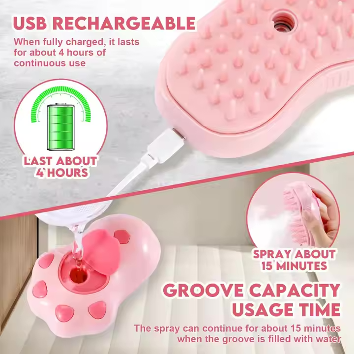 This brush is USB rechargeable, offering up to 4 hours of use on a single charge, and holds enough water for approximately 15 minutes of continuous spray. Its ergonomic, anti-slip design ensures comfort and control during grooming sessions.