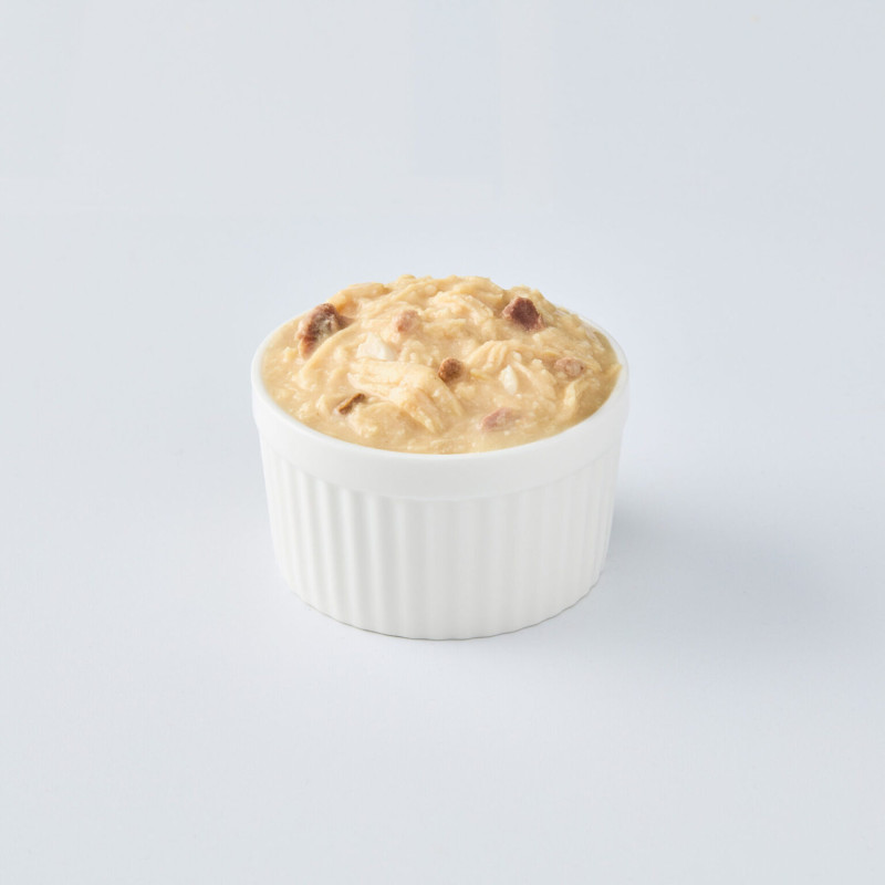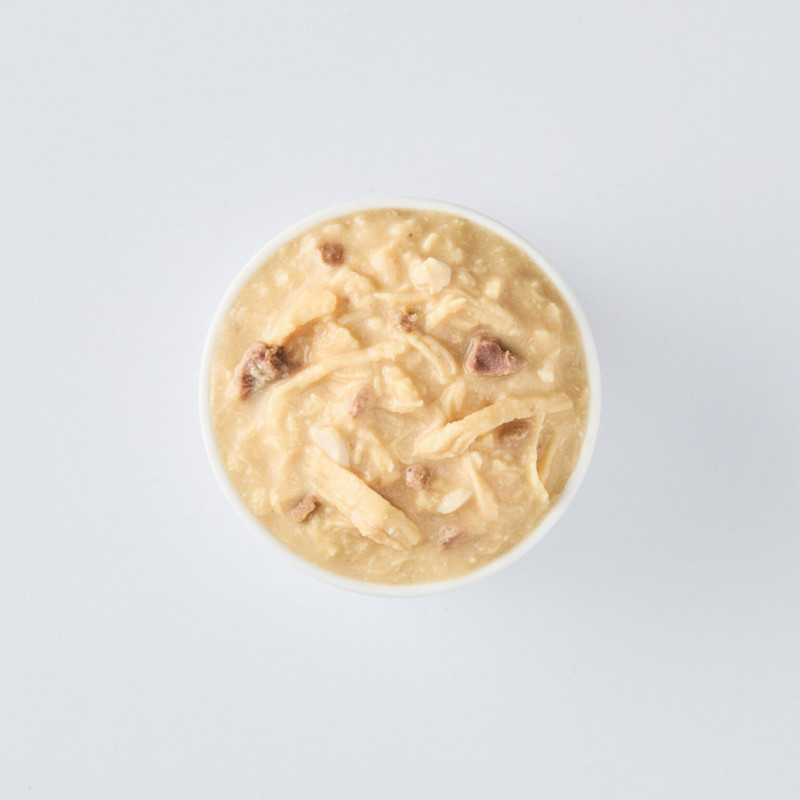 This recipe is made with chicken meat, chicken organs (gizzards, livers, hearts), chicken broth, and quail egg to provide high-quality protein and essential nutrients. It also contains modified tapioca starch and xanthan gum for texture, along with vitamins and minerals to ensure a balanced diet. Coconut oil (MCTs), sunflower oil, and krill oil are added to support skin and coat health, while fructooligosaccharide aids digestion. Additionally, taurine is included to promote heart and eye health.