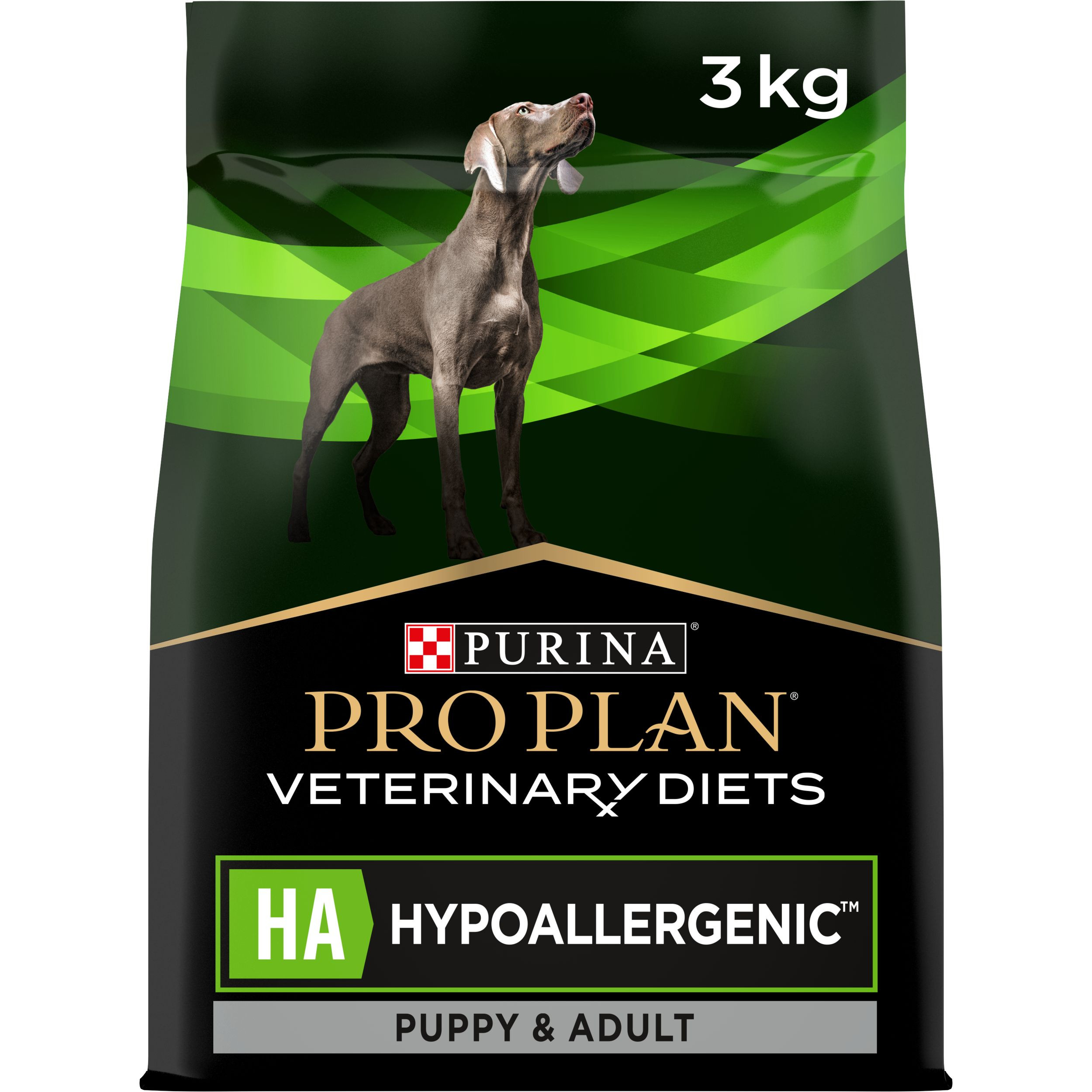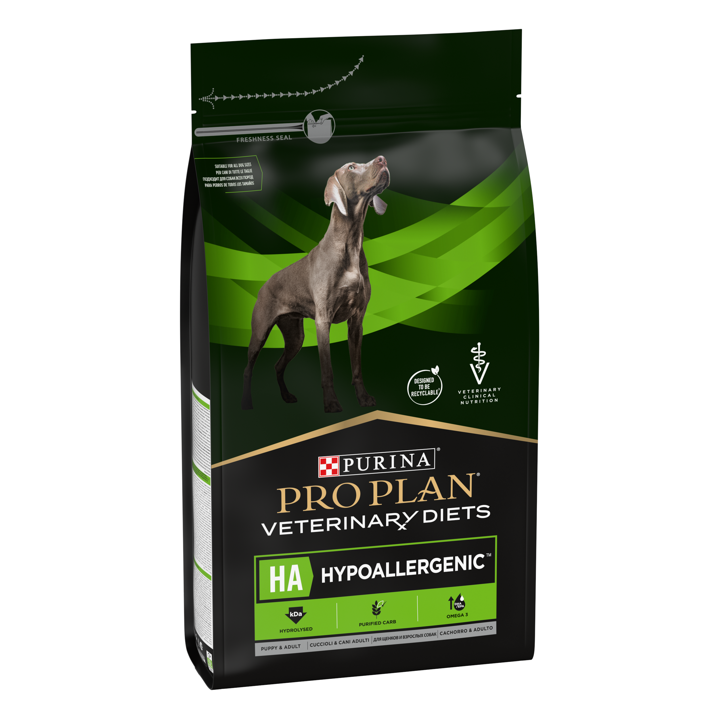 Pro Plan Veterinary Diets HA Hypoallergenic Canine Formula features a single hydrolyzed protein source and purified carbohydrate to minimize the risk of adverse food reactions. Ideal for use in elimination trials and long-term dietary management of food allergies.