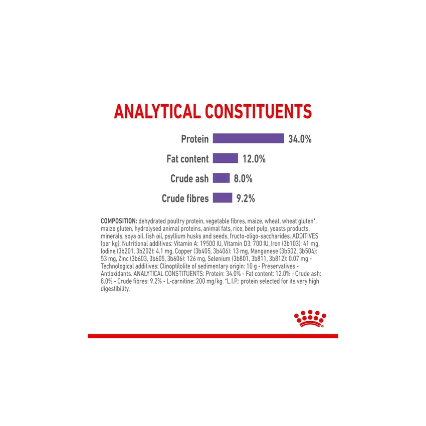 Dehydrated poultry protein, maize, maize gluten, vegetable protein isolate*, rice, wheat, vegetable fibres, hydrolysed animal proteins, beet pulp, animal fats, minerals, soya oil, fish oil, fructo-oligosaccharides (FOS), yeasts, L-carnitine, marigold extract (source of lutein).