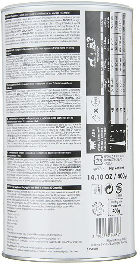 Royal Canin Babydog Milk is specially formulated to closely mimic the composition of maternal milk, making it ideal for newborn puppies from birth to weaning. With balanced energy and protein levels, this premium milk replacer supports steady, harmonious growth during the earliest and most delicate stages of life.