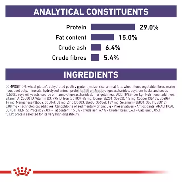 Wheat gluten, dehydrated poultry protein, maize, rice, animal fats, wheat flour, vegetable fibres, maize flour, beet pulp, minerals, hydrolysed animal proteins, fish oil, fructo-oligosaccharides, psyllium husks and seeds (0.50%), soya oil, yeasts (source of mannan-oligosaccharides), marigold meal.