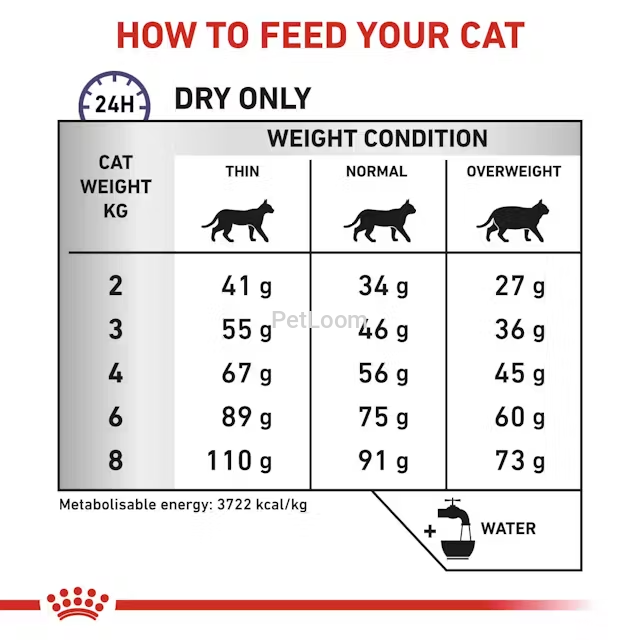 Refer to the feeding chart on the packaging for portioning based on your cat’s weight and body condition (thin, normal, overweight). Always consult with a veterinary professional for tailored advice.