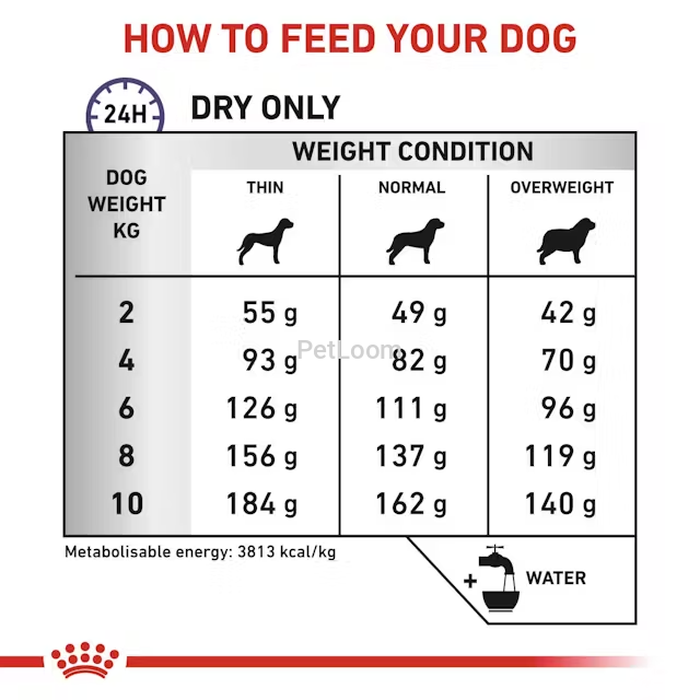 Feeding amounts vary by weight and body condition (thin, normal, overweight). Refer to the full feeding table on-pack or consult your vet for exact guidance.