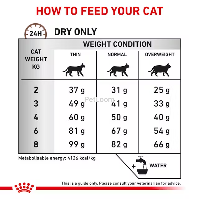 Refer to the feeding chart on the packaging based on your cat’s weight and condition (thin, normal, overweight). Adjust portions as needed under veterinary guidance.