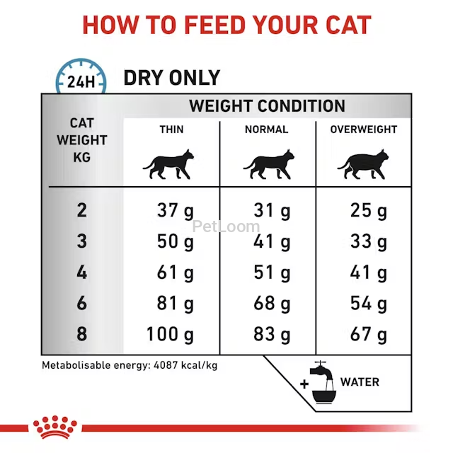Feeding amounts vary based on your cat’s weight and body condition. Please refer to the table on the packaging or consult your veterinarian to determine the most suitable ration for your pet.