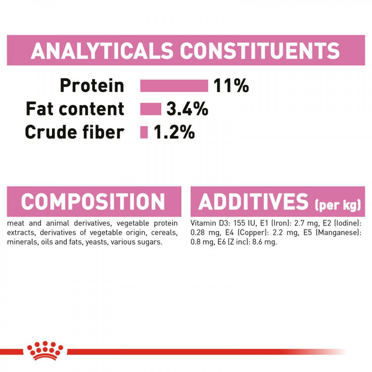 Nutritional additives: Vitamin D3: 85 IU, E1 (Iron): 4 mg, E2 (Iodine): 0.27 mg, E4 (Copper): 2.2 mg, E5 (Manganese): 1.3 mg, E6 (Zinc): 13 mg