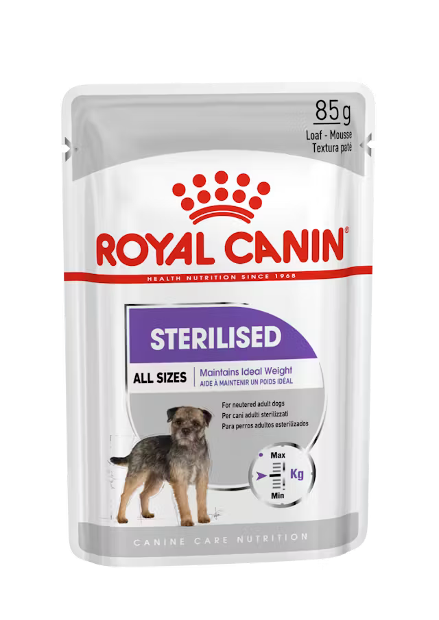 Royal Canin Sterilised Loaf is specially formulated for neutered adult dogs of all sizes who are prone to weight gain due to reduced energy needs post-sterilisation. With its tailored calorie content, high-quality proteins, and satisfying texture, this complete wet food helps maintain lean muscle mass, supports satiety between meals, and contributes to healthy digestion—while keeping your dog at their ideal weight.