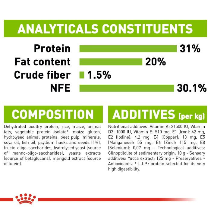 Rice, dehydrated poultry protein, maize, animal fats, maize flour, hydrolysed animal proteins, beet pulp, fish oil, vegetable fibres, soya oil, minerals, fructo-oligosaccharides (FOS), psyllium husks and seeds, yeast extracts (source of beta-glucans), marigold extract (source of lutein).