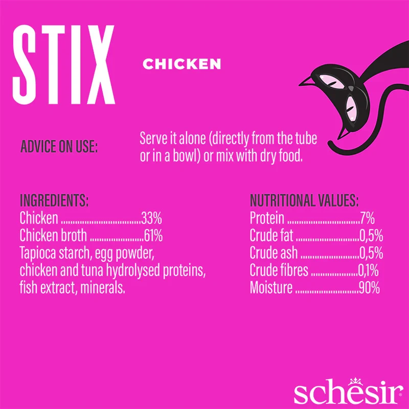 Schesir Stix with Chicken in Cream is a supplementary snack packed with high-quality chicken protein in a smooth, creamy mousse. This grain-free formula is designed to provide an irresistible treat that can be served alone, directly from the tube, or as a meal topper to enhance dry food with extra flavor and moisture.