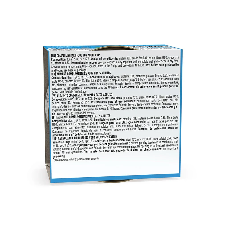 Simple, natural, and protein-rich, Schesir Tuna in Cooking Water features real tuna fillets cooked gently in their own juices to preserve flavor and texture. Ideal for cats who prefer a light, fluid consistency and a clean, natural taste.