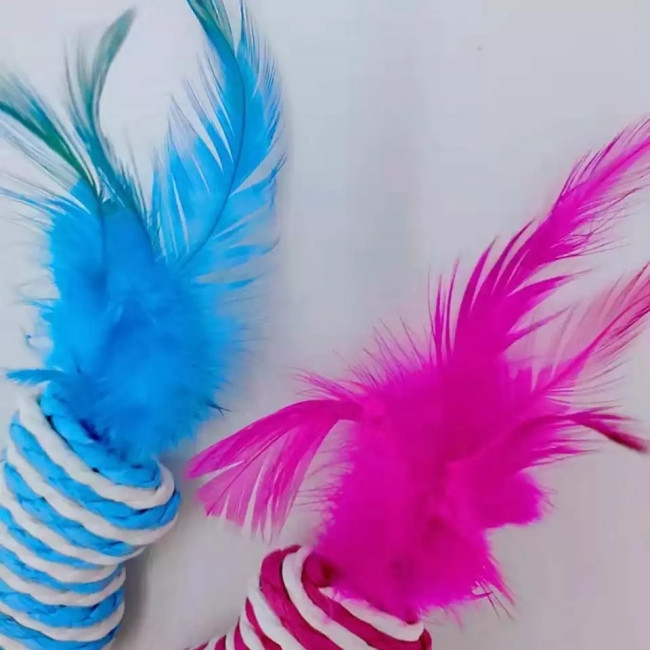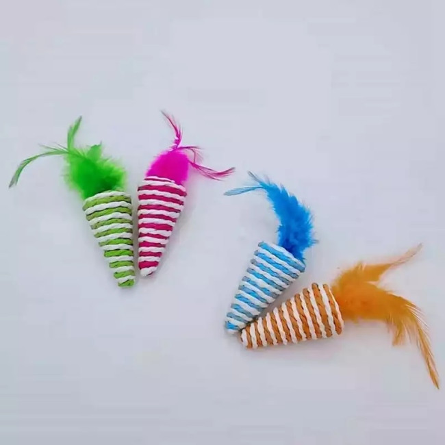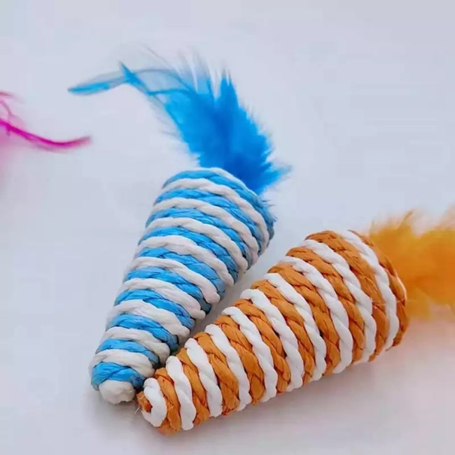 Keep your feline friend happily entertained and away from your furniture with this colorful sisal scratching toy! Designed in a playful cone shape with a feathered tail, it's perfect for both batting and scratching.