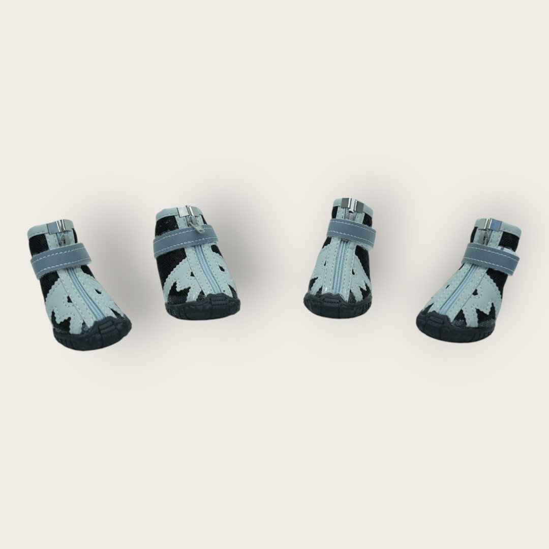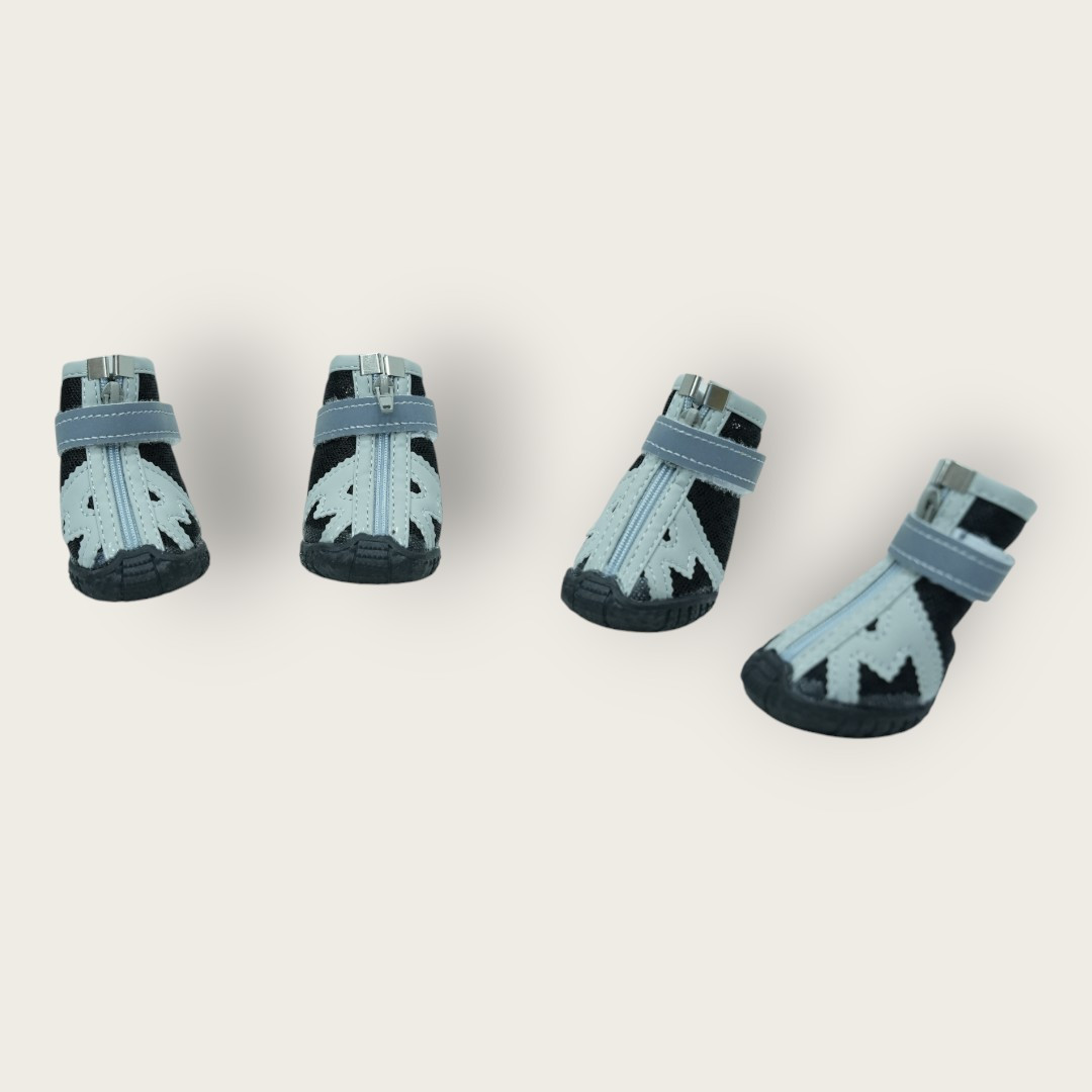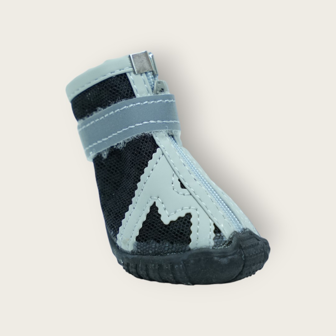 Designed for active dogs, these sporty black and grey shoes offer reliable paw protection and a sleek, athletic look. Whether you're navigating snowy streets, hot pavement, wet sidewalks, or slippery indoor floors, these shoes provide the traction, comfort, and durability your dog needs. The combination of a front zipper and Velcro strap ensures a snug fit that stays secure through every step.