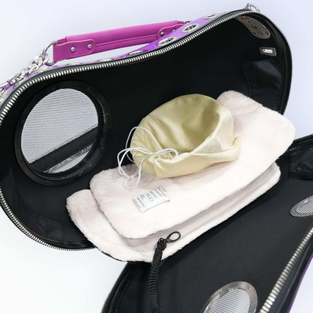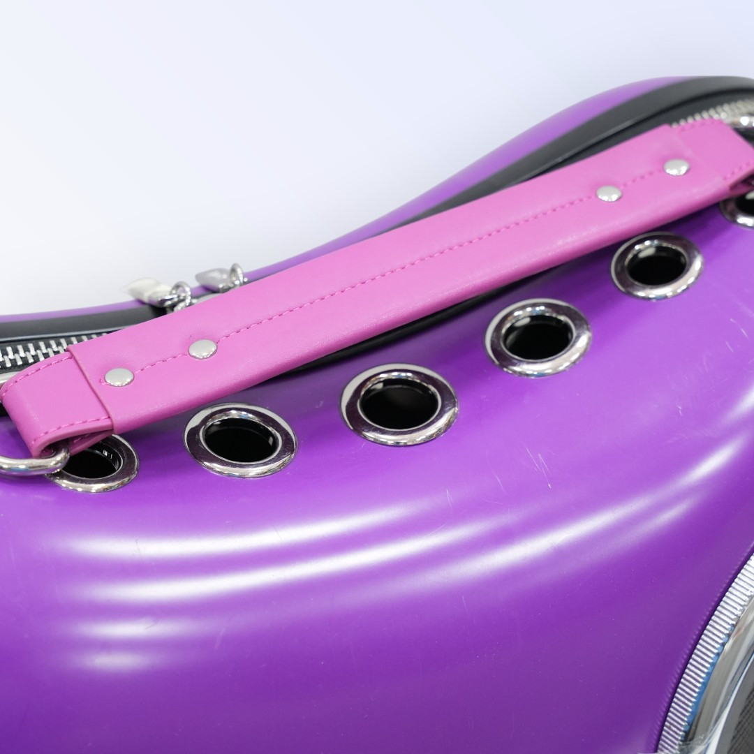 This futuristic and stylish purple capsule pet carrier is designed to provide comfort and safety for your pet while traveling. The spherical shape with a transparent viewing window allows your pet to see their surroundings, helping reduce anxiety during transit. Equipped with a durable, snake-patterned shoulder strap for convenient carrying, the carrier also includes ventilation holes to ensure proper airflow. Its lightweight yet sturdy build makes it perfect for pet parents on the go.
